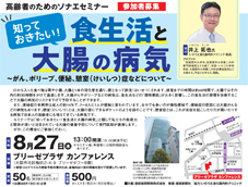 先日,梅田にあるブリーゼプラザで「食生活と大腸の病気」の講演を開かせて頂きました.食生活と大腸憩室,大腸ポリープや大腸がん,便秘症,憩室や大腸ポリープの内視鏡像などについて説明させて頂きました.参加された方々は皆様とても熱心で,私も大変充実した時間を過ごすことができました.