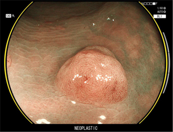下の写真の上段は,CAD EYEが大腸ポリープを認識したところです(わかりやすくするためにあえて目立つポリープの写真を使用しています).下段はさらに「neoplastic(腫瘍性ですので治療してくださいね.ということです)」と診断まで行ってくれたところです.